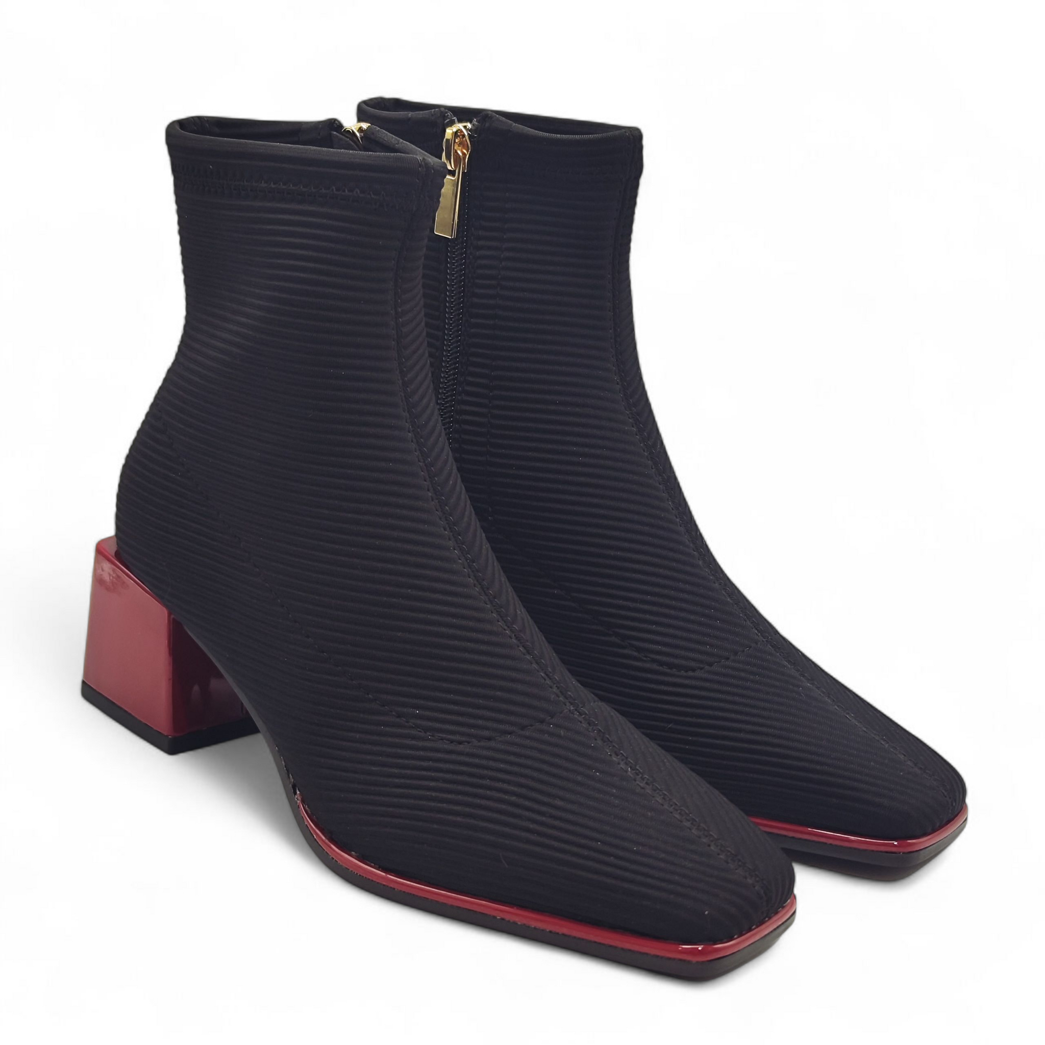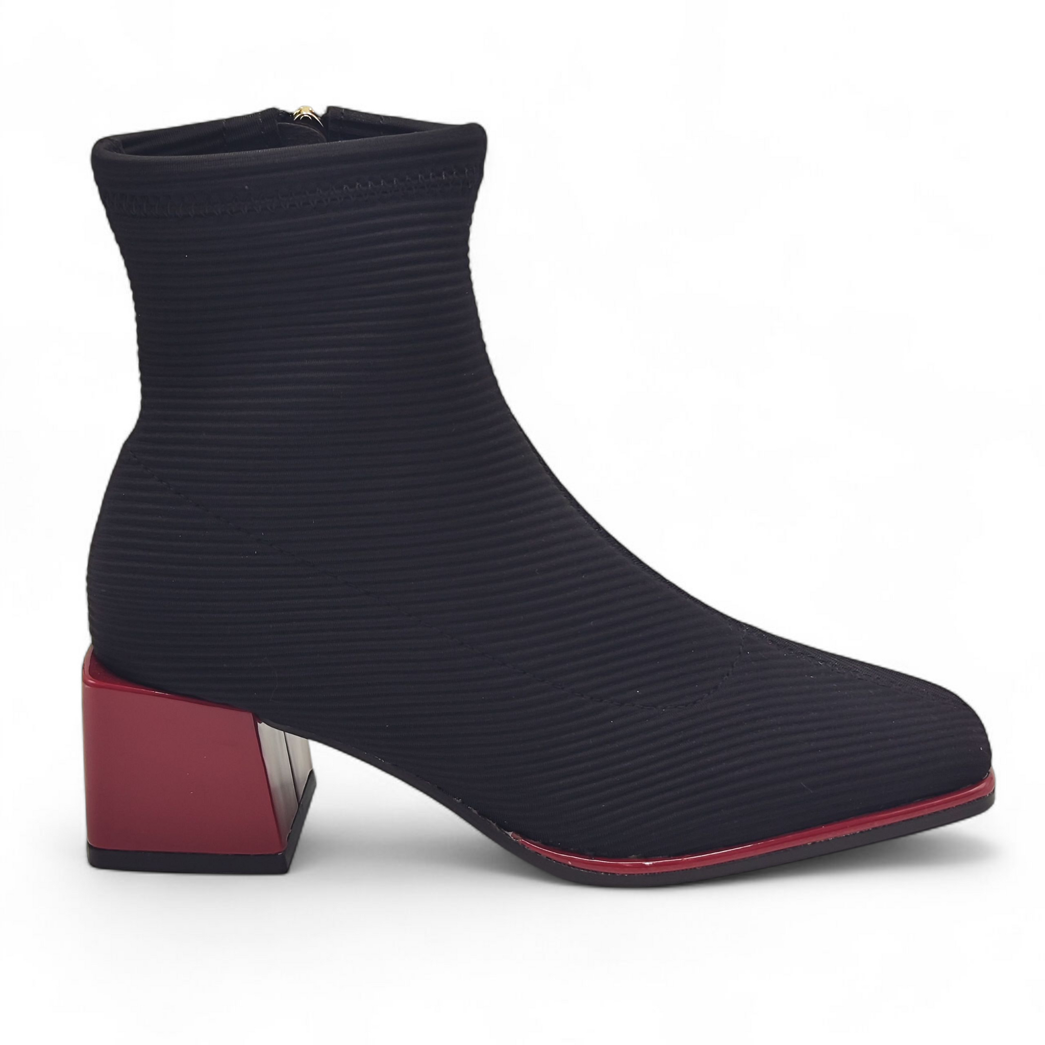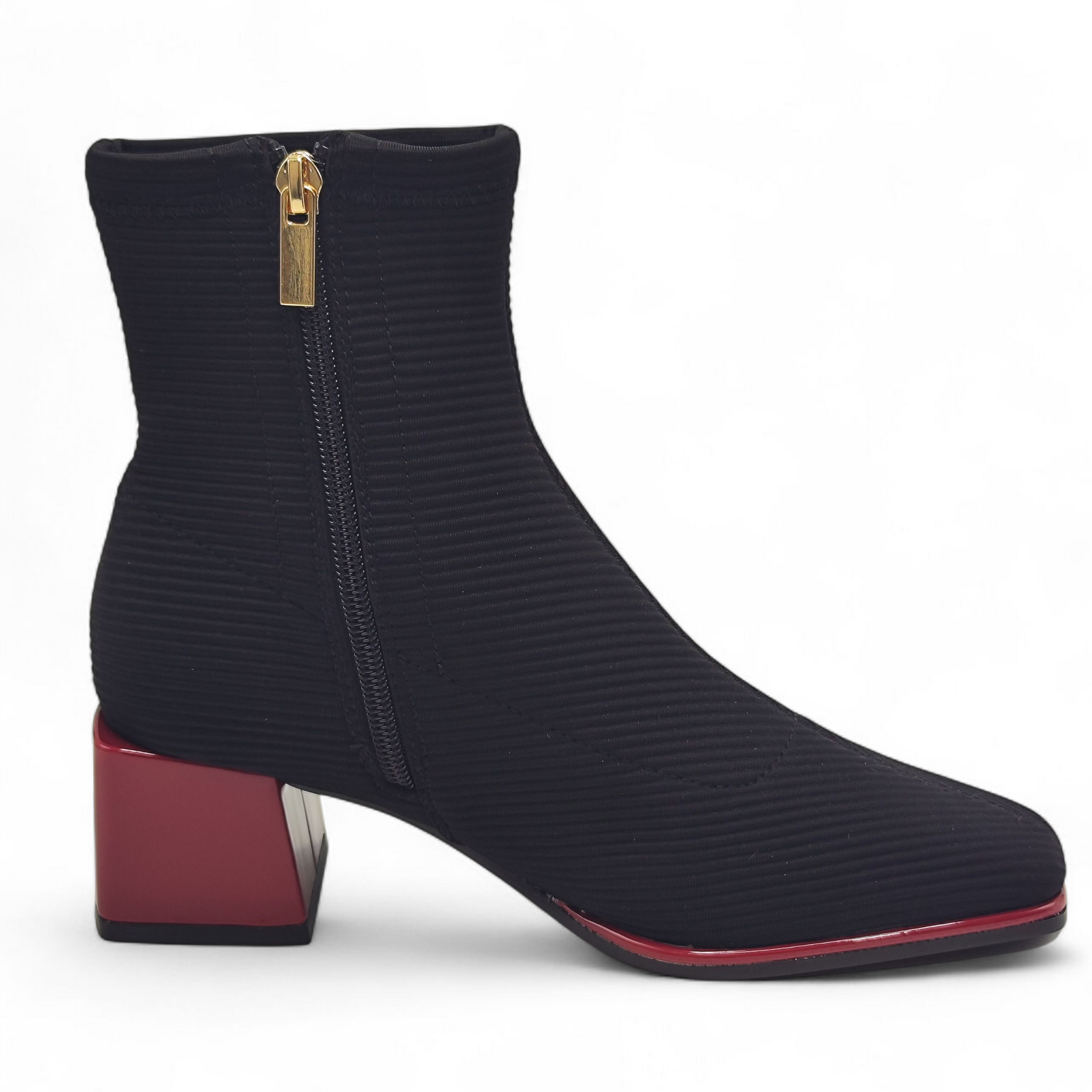 Botín de licra, efecto canalé. Suela y tacón cuadrado en color rojo. La punta del botín es cuadrada y todo ello le otorga un diseño moderno y actual.