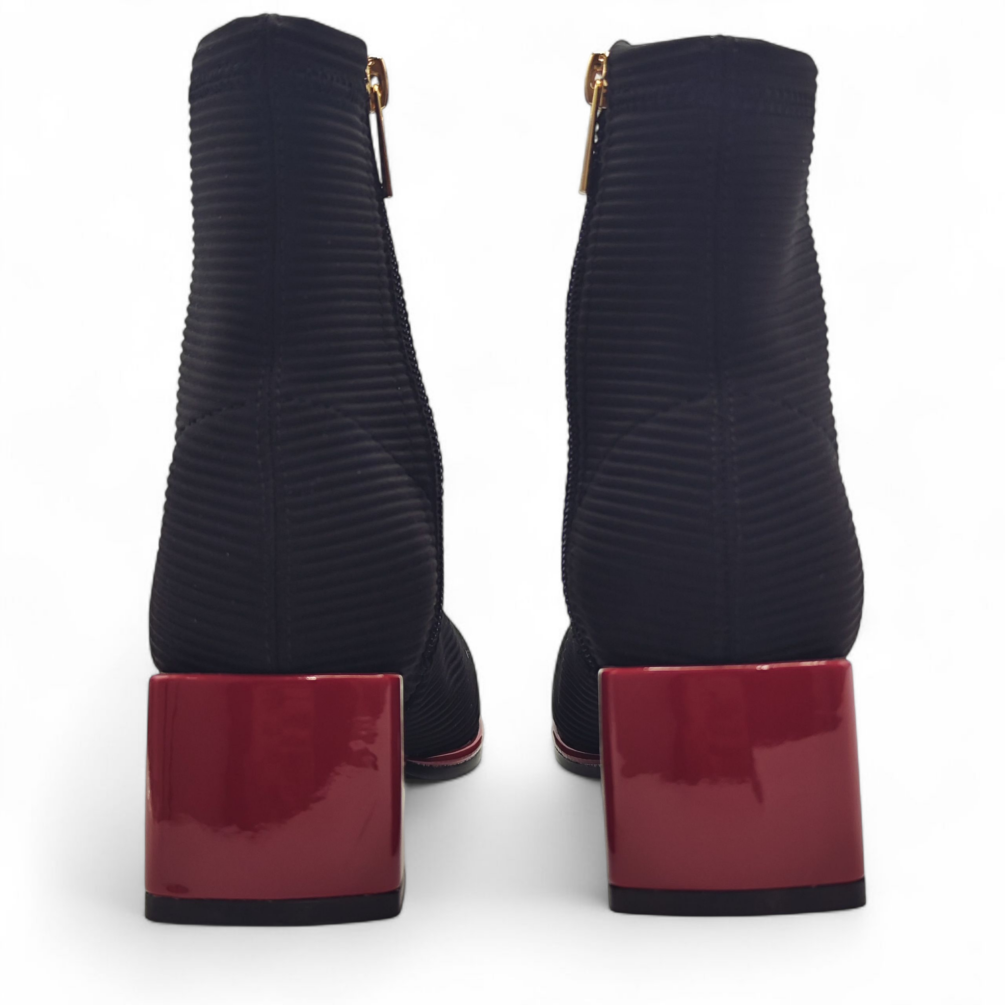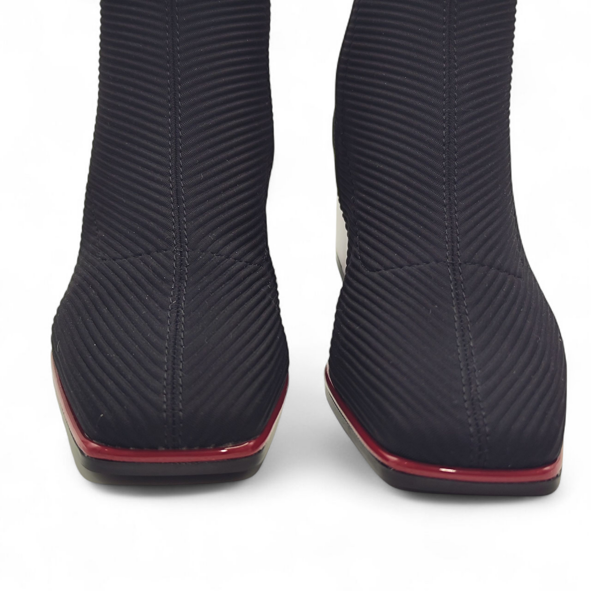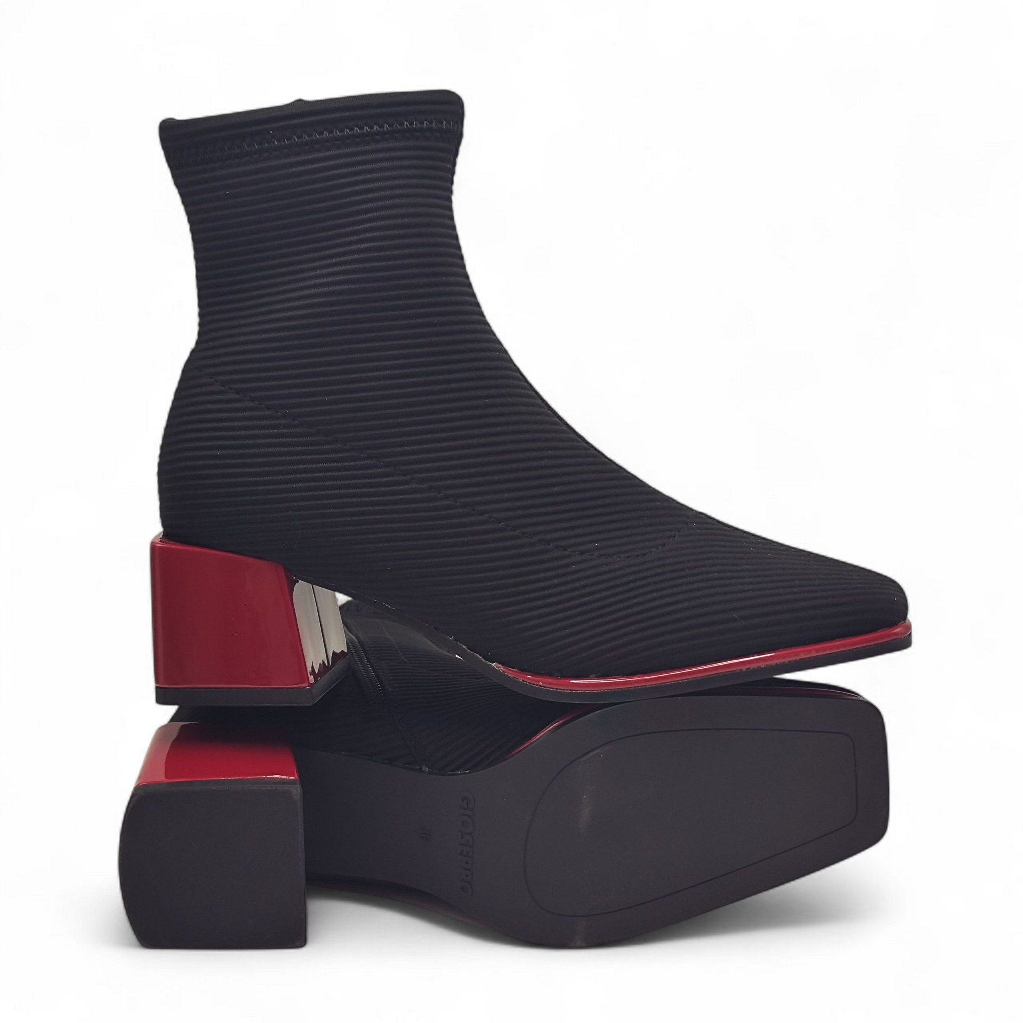 Botín de licra, efecto canalé. Suela y tacón cuadrado en color rojo. La punta del botín es cuadrada y todo ello le otorga un diseño moderno y actual.