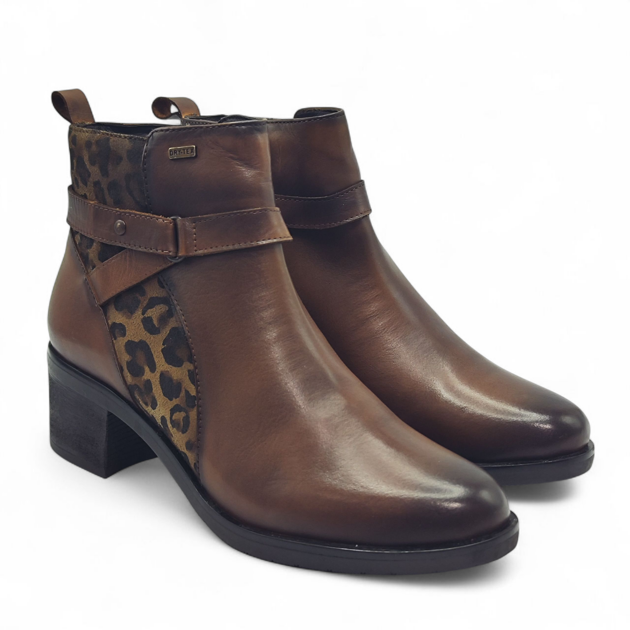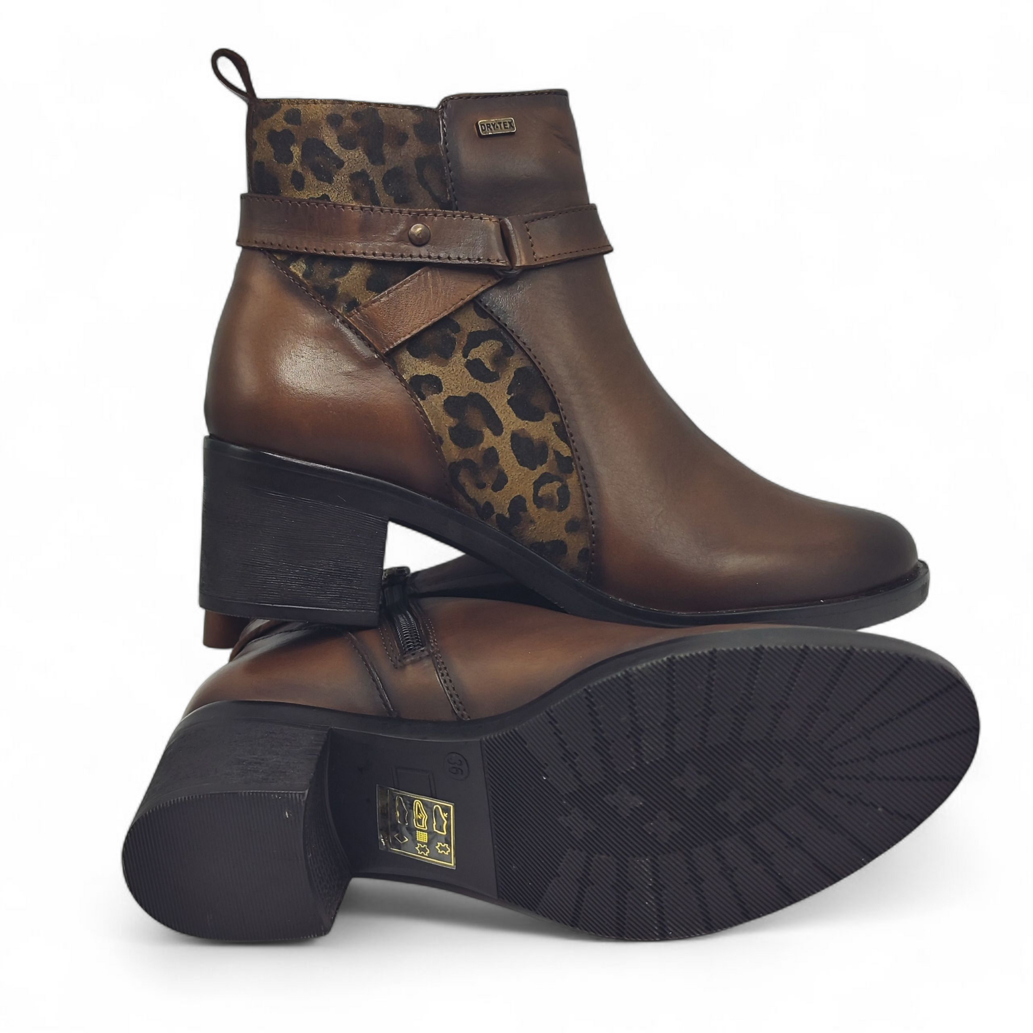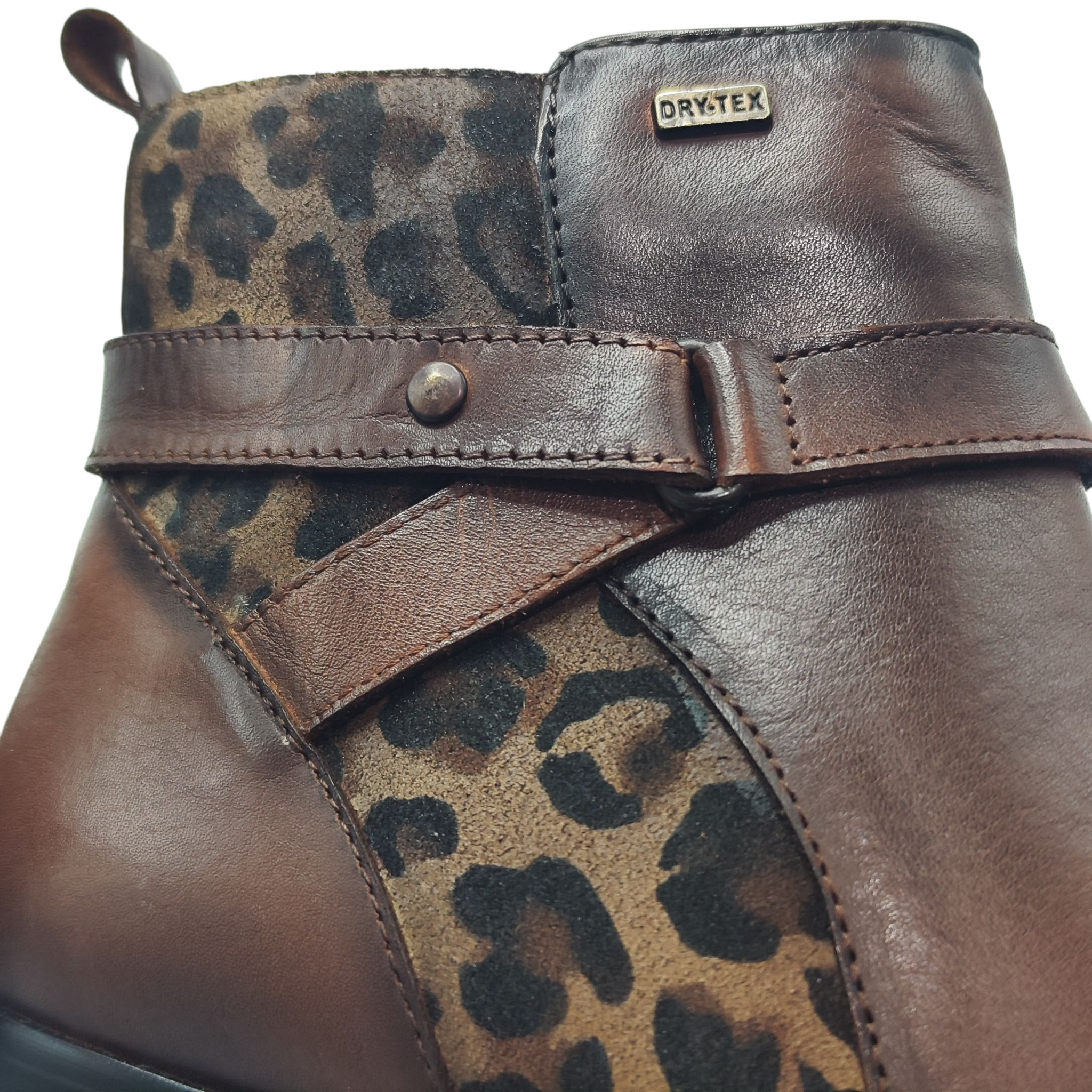 Botín de piel con membrana Tex apto para la lluvia. Lleva un estampado print y correa al tobillo que le otorga un diseño moderno y actual.