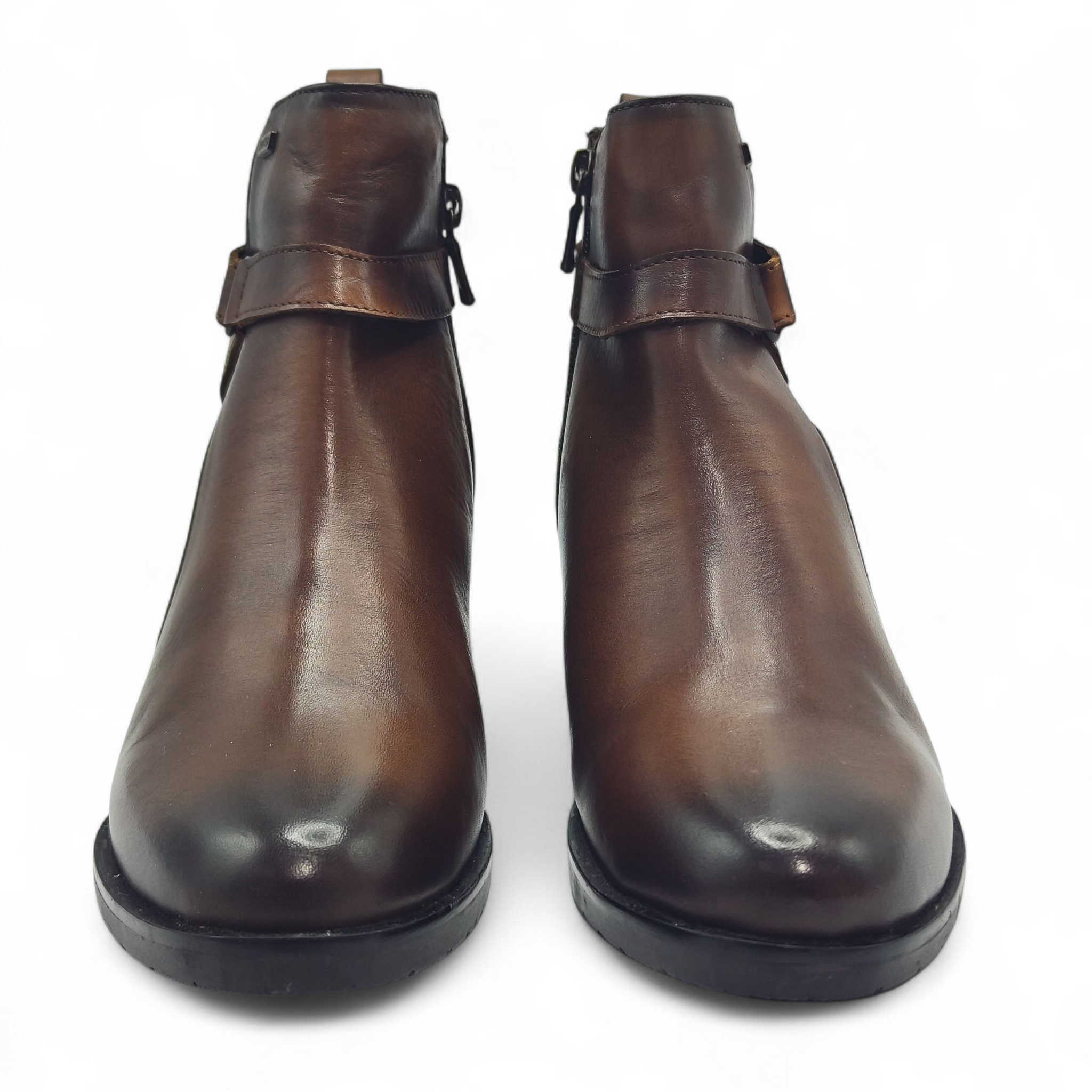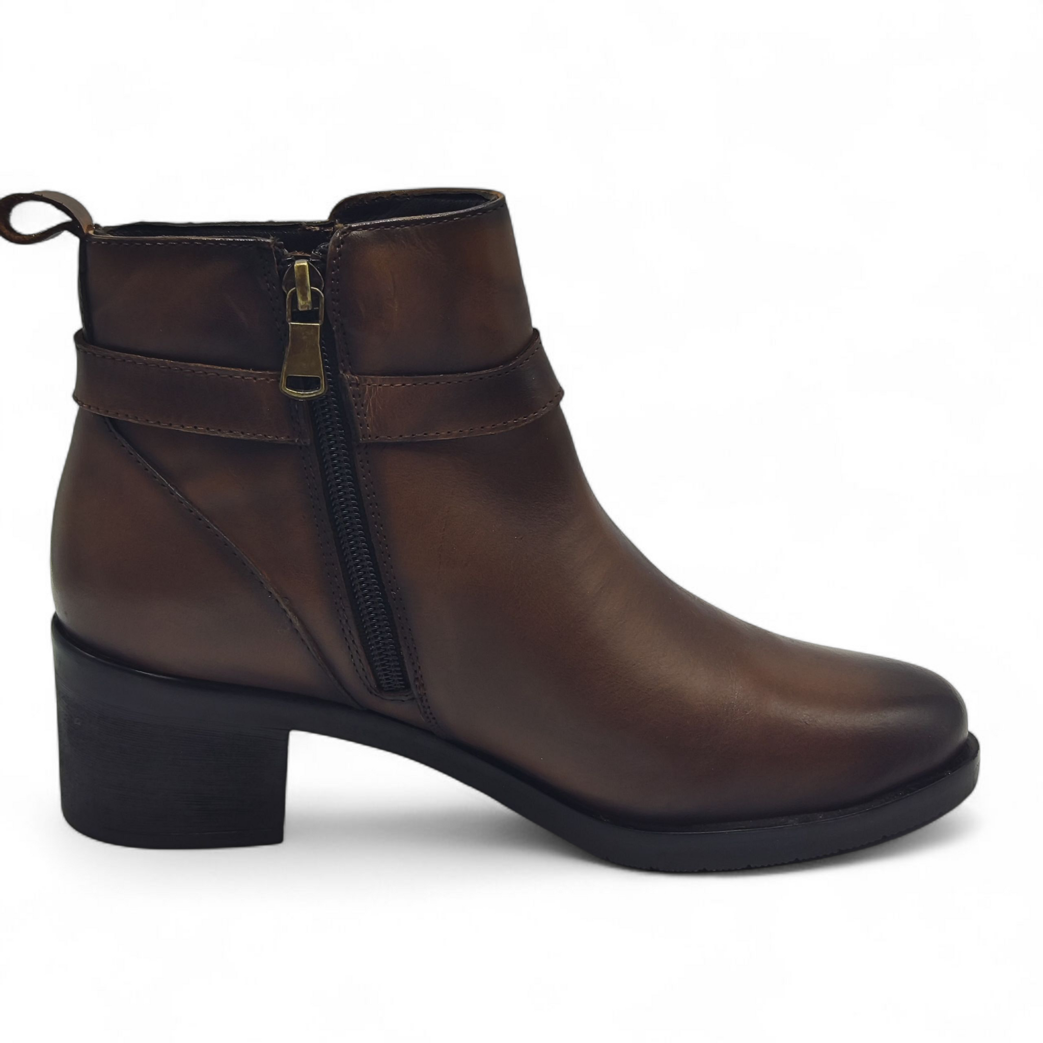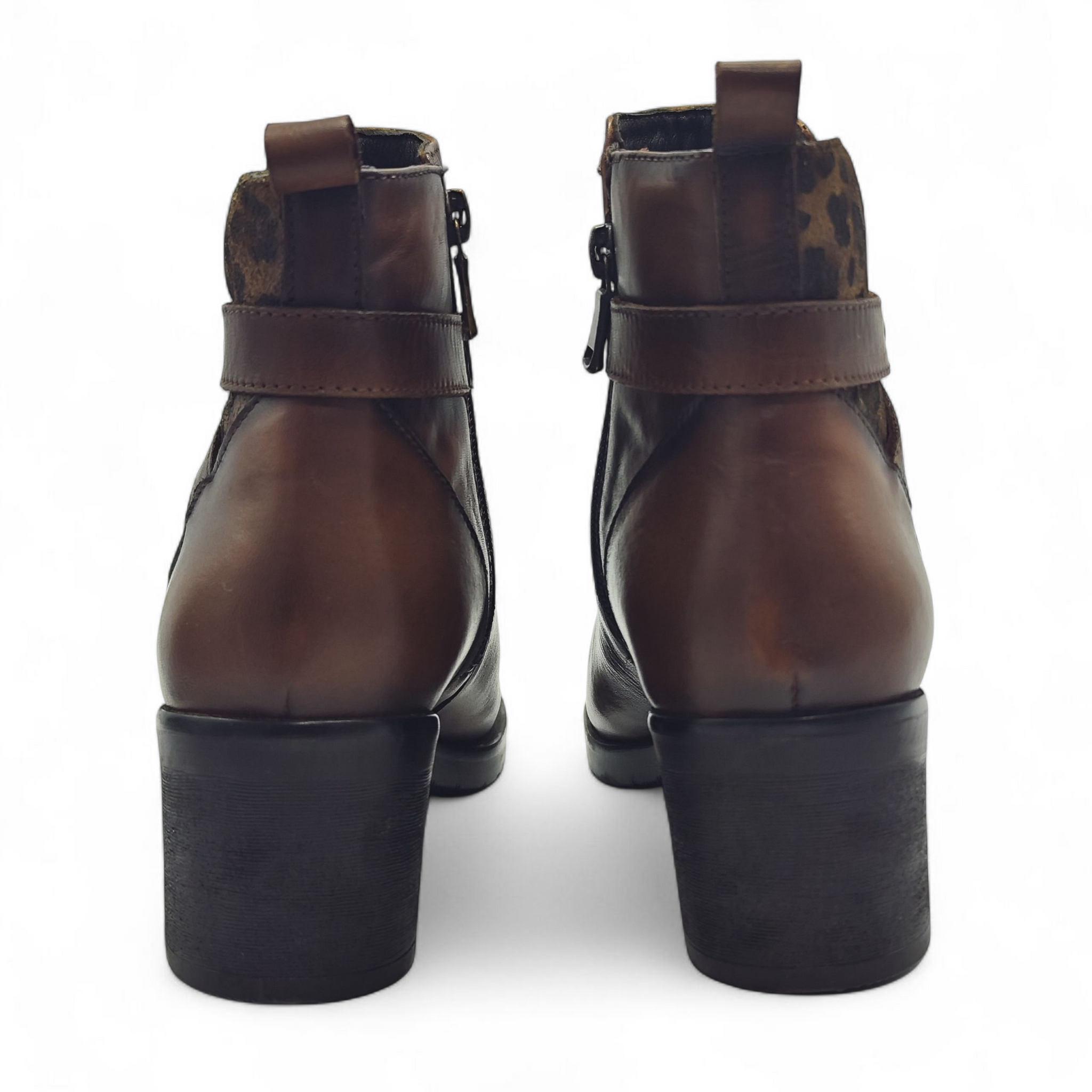Botín de piel con membrana Tex apto para la lluvia. Lleva un estampado print y correa al tobillo que le otorga un diseño moderno y actual.