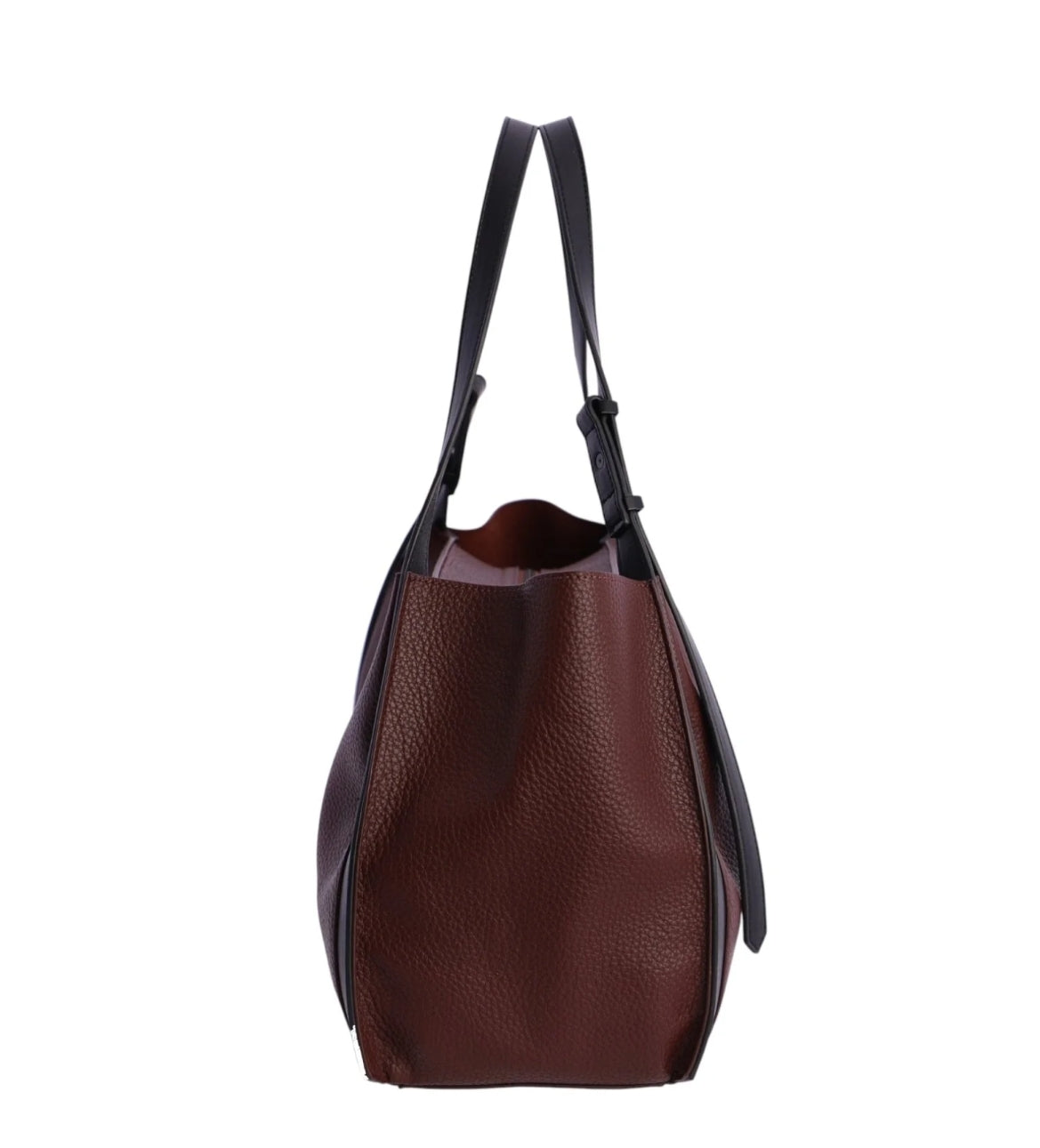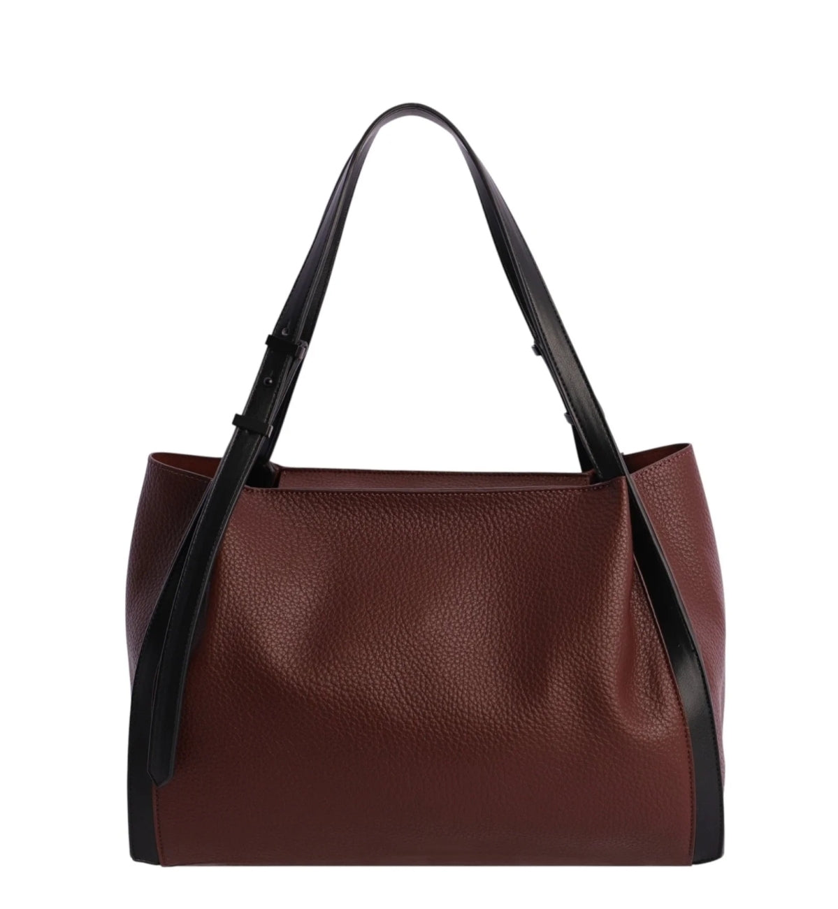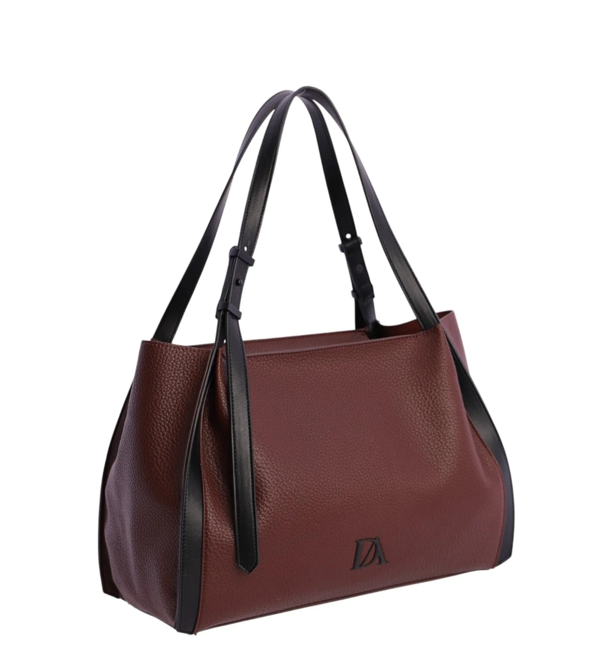 Shopper combinado en negro y burdeos metalizado con cierre cremallera. En su interior incluye amplio neceser (24cm ancho*17cm alto*9cm fondo). Asas regulables en altura.