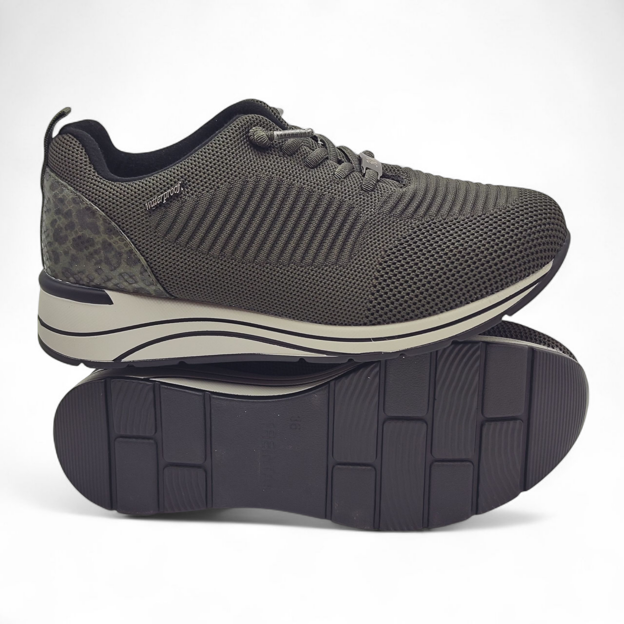 Zapatilla textil con membrana impermeable. Cierre con goma. Detalle en serpiente al tono de la zapatilla en el talón.