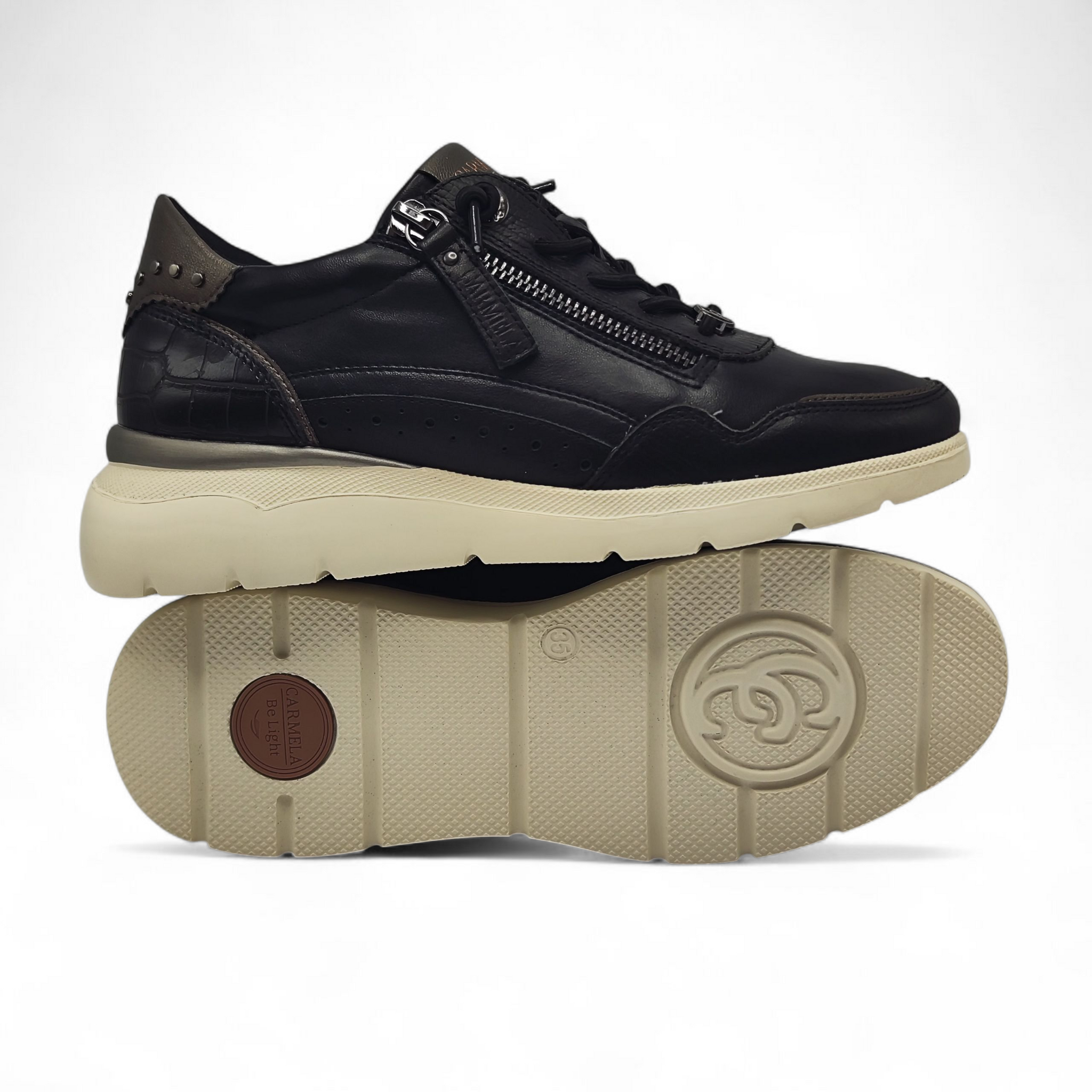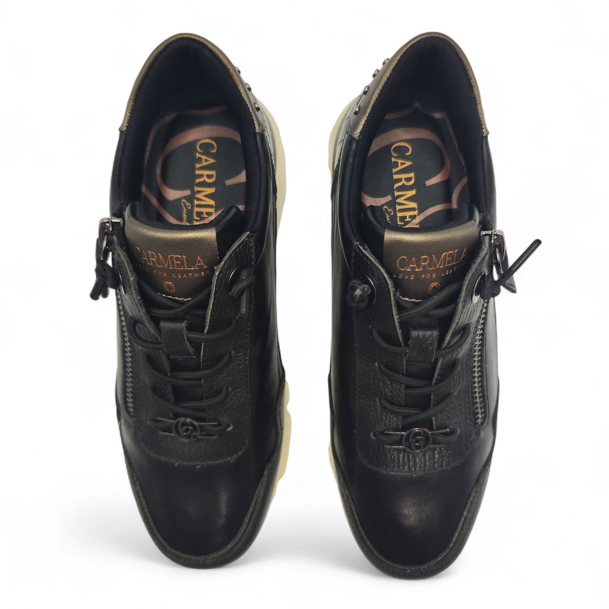 Zapatilla fabricada en piel de alta calidad. Cierre mediante cremallera lateral y cordones ajustables. Detalle de piezas con efecto metalizado y tachuelas pequeñas. Suela de goma antideslizante.