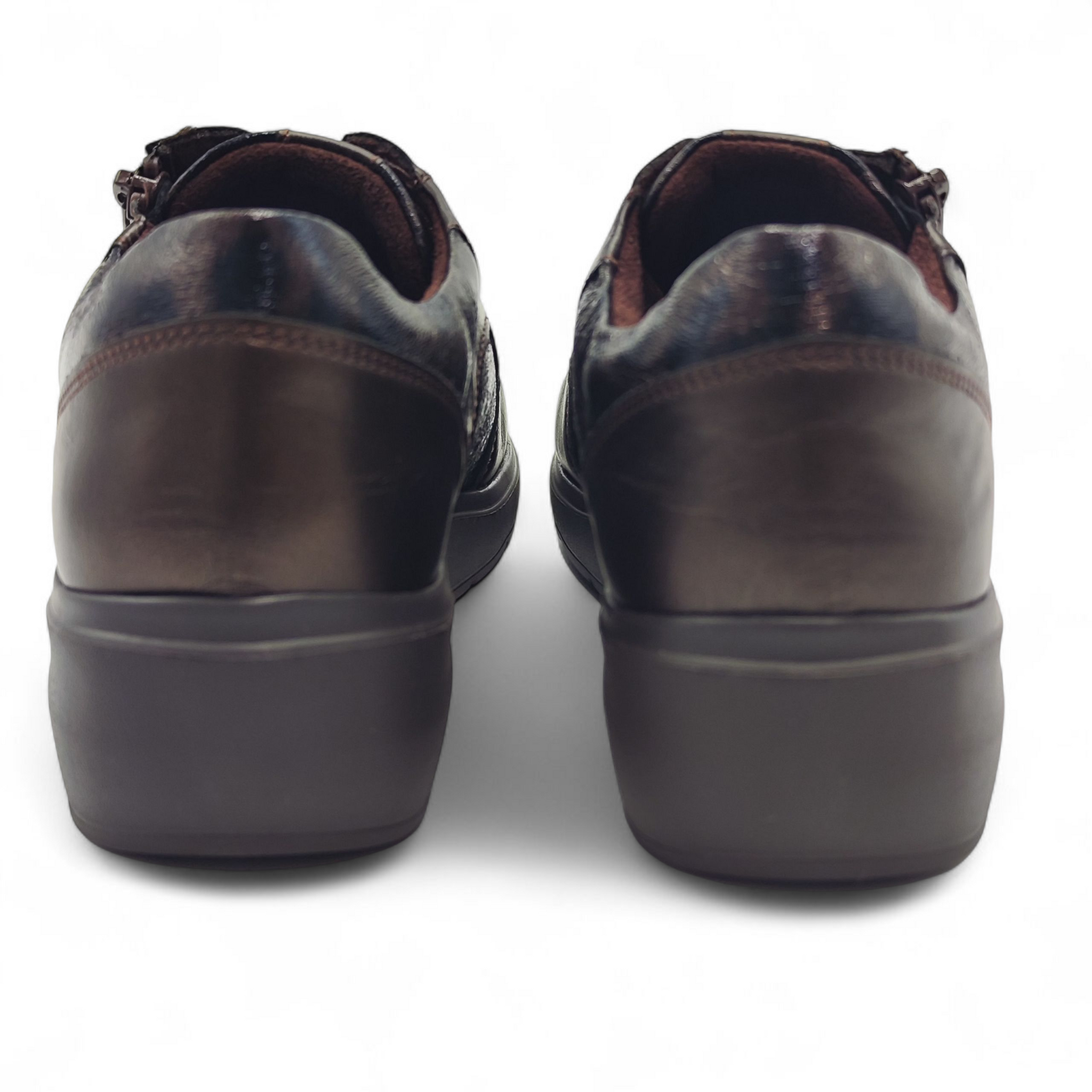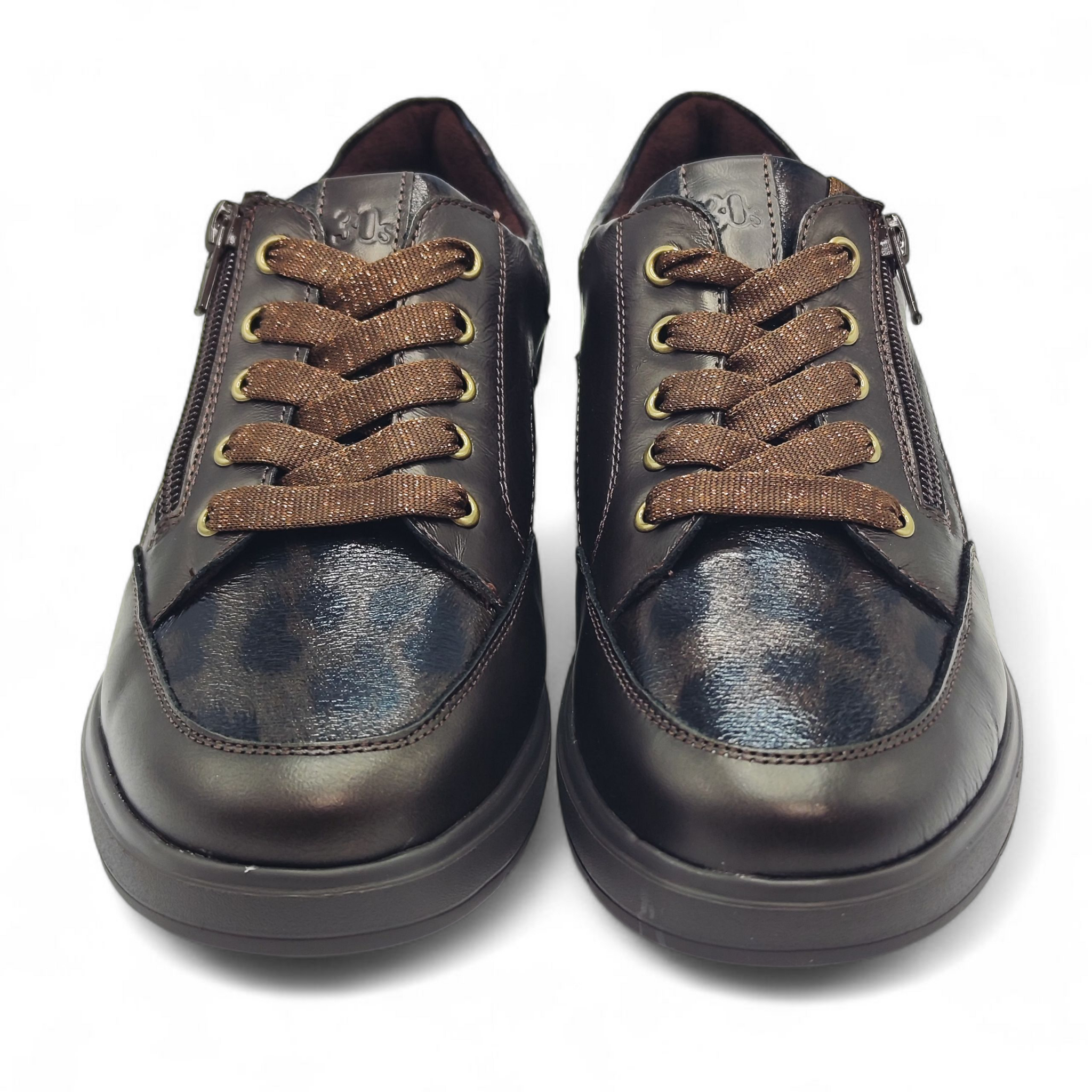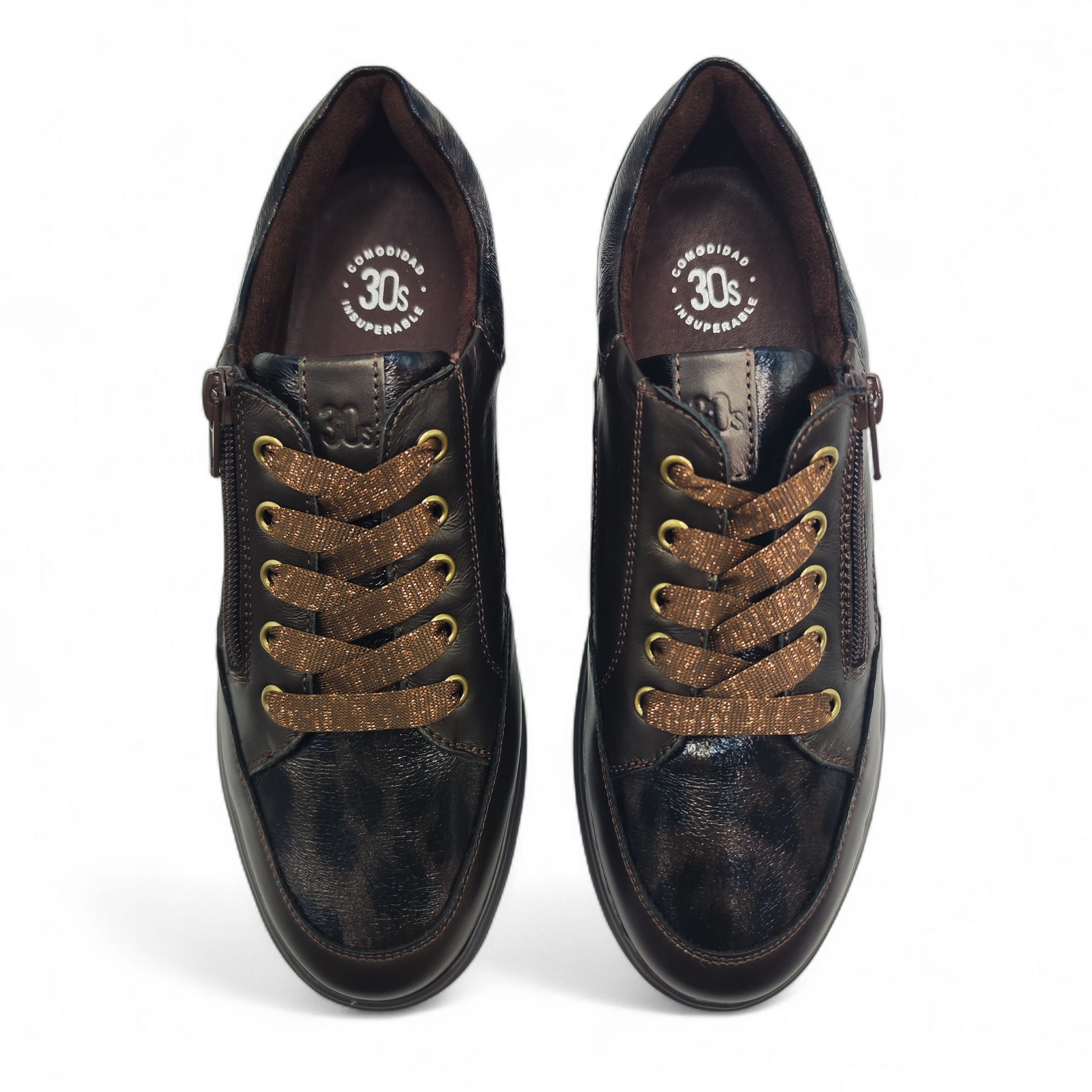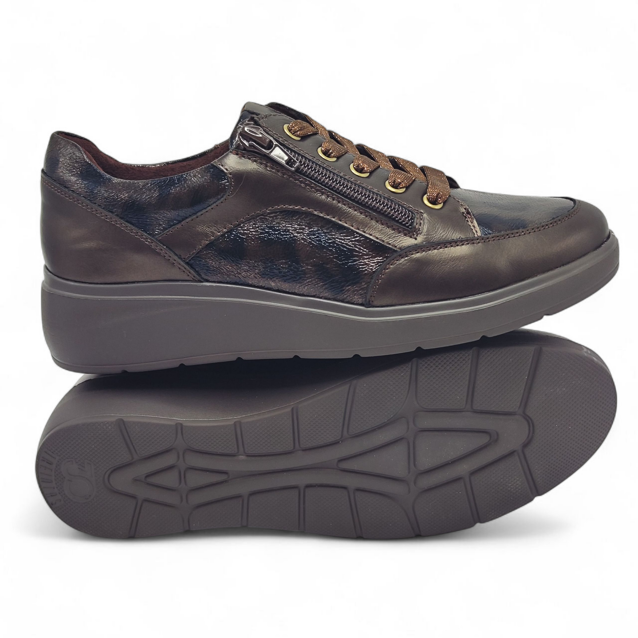 Zapato confort de piel metalizada en color marrón con detalles en print. Cierre de cordones y cremallera.