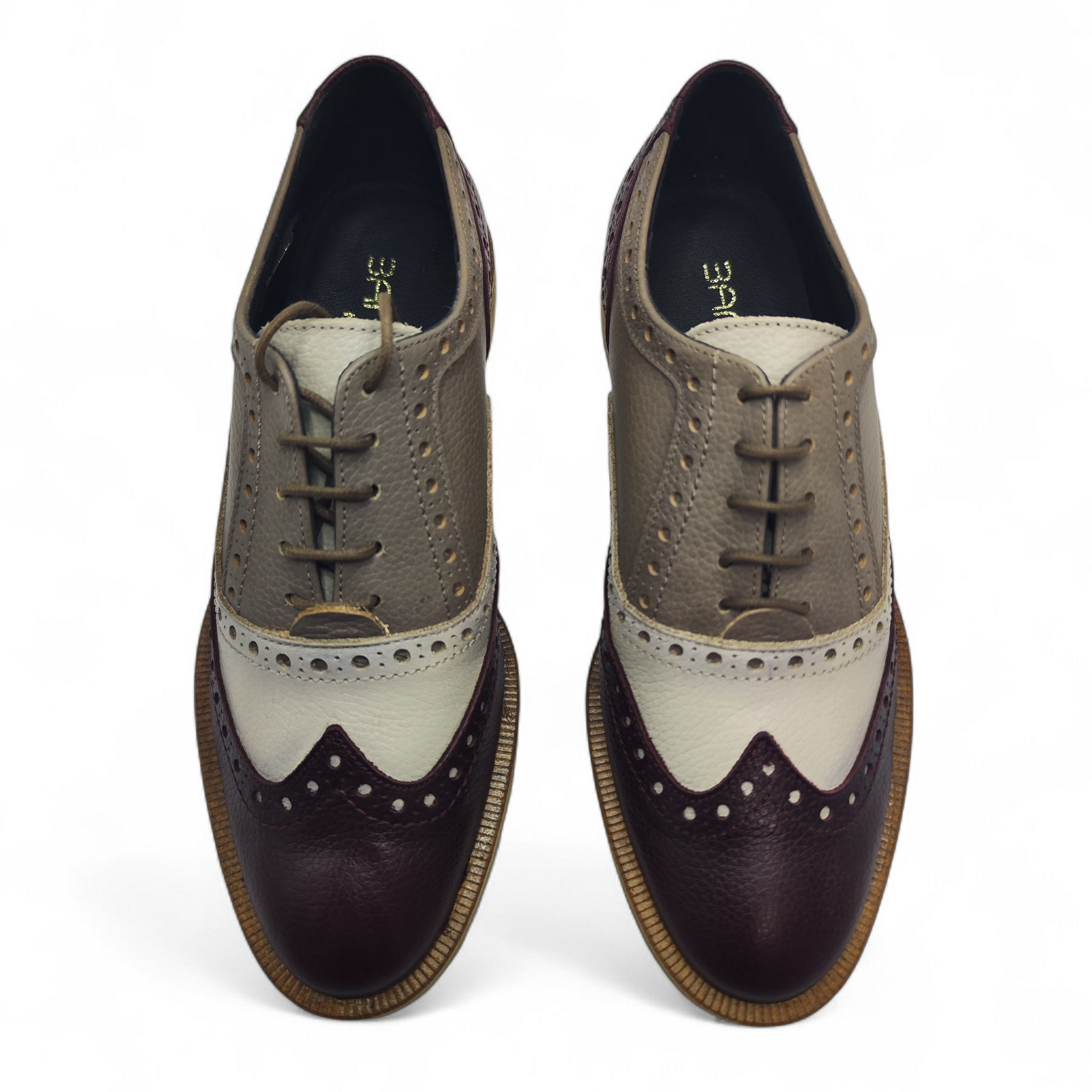 Zapato de piel estilo Oxford con cordones combinado a 3 colores: Burdeos, Beige y Taupe. Interior forrado de tejido técnico transpirable. Suela de crepe tocino, antideslizante y aislante del frío. Altura del tacón 4 cm aprox. con una suela base de 1 cm. Se recomienda su talla habitual.